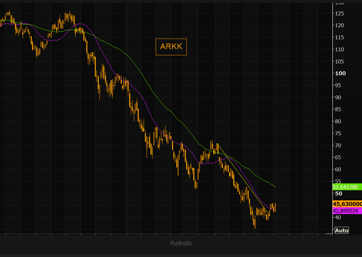 Por el contrario, en el siguiente gráfico, observamos la caída del ETF Tech más representativo del mercado vinculado a ciclo de crecimiento rápido con tecnologías disruptivas ; el ARKK de Cathie Wood.