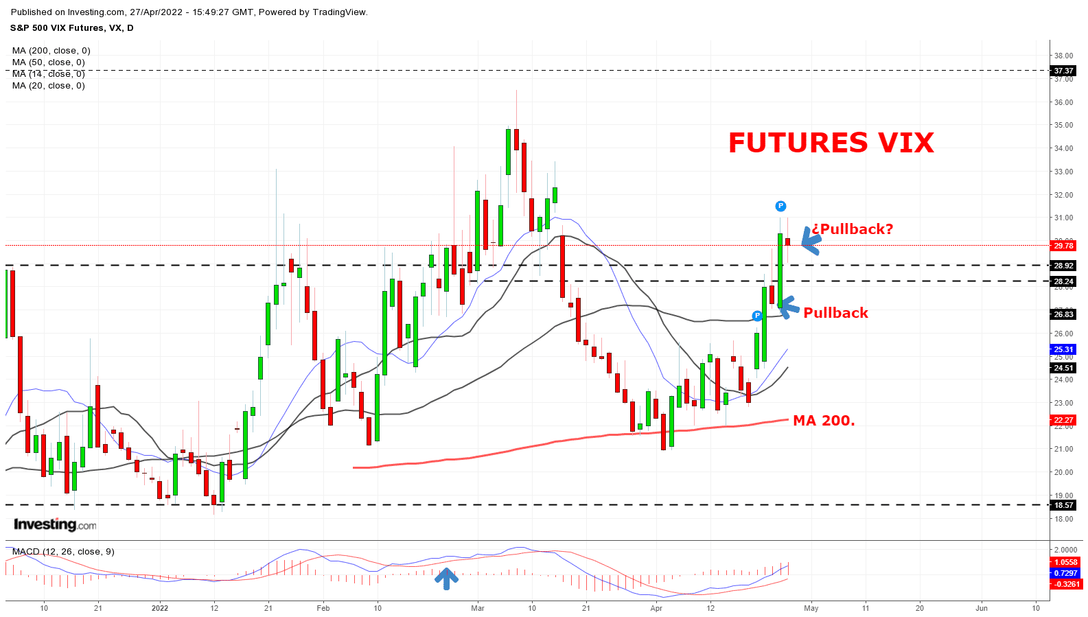 Los rebotes en las FANNG ( AMZN, Apple y MSFT) y TSLA pierden momentum a medida que avanza la sesión. Por ello, la subida del S&P 500 no va más allá del +1 % salvo sorpresas en el último tercio de la sesión. El VIX, muestra un patrón de pullback que podría activarse mañana. Algo así como una “activación retrasada” de la envolvente alcista que hoy se frustró en el índice de volatilidad.