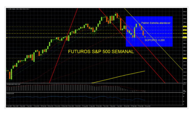 Si es por debajo de la mencionada cotización, recordamos que en el semanal, el lunes, publicamos un patrón bajista de “estrella del atardecer” listo para activarse el próximo lunes. Su soporte, 4.200 ptos; por eso es tan importante esa cota.