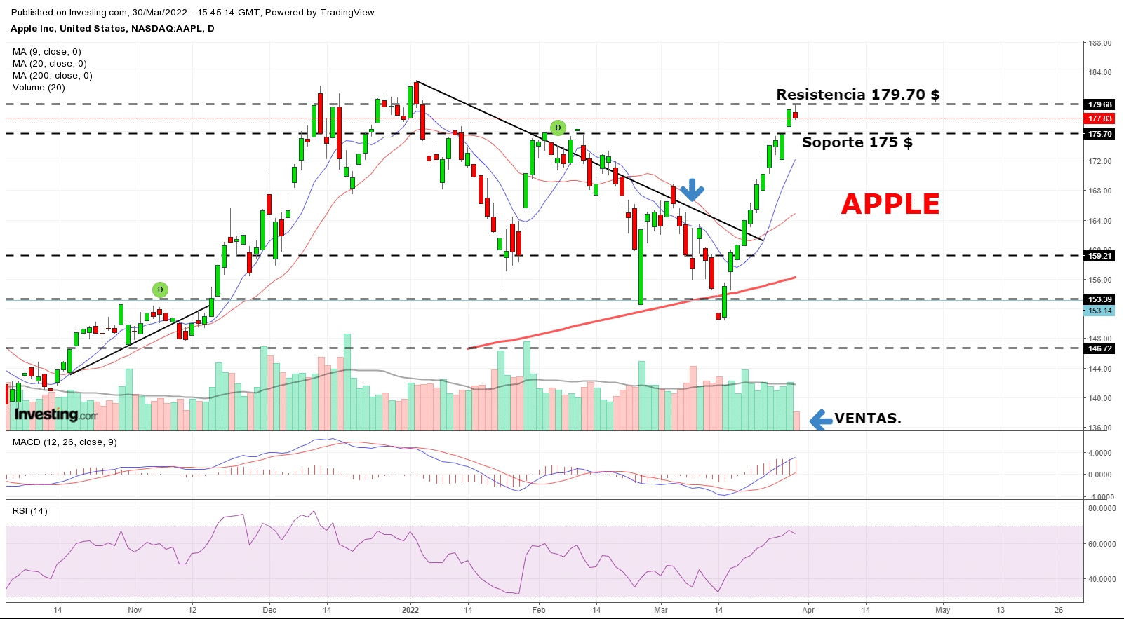 Apple, resistencia en 179.70 $ la acción y primera sesión de volumen neto vendedor. Algo que no sucedía desde el 15 de marzo.