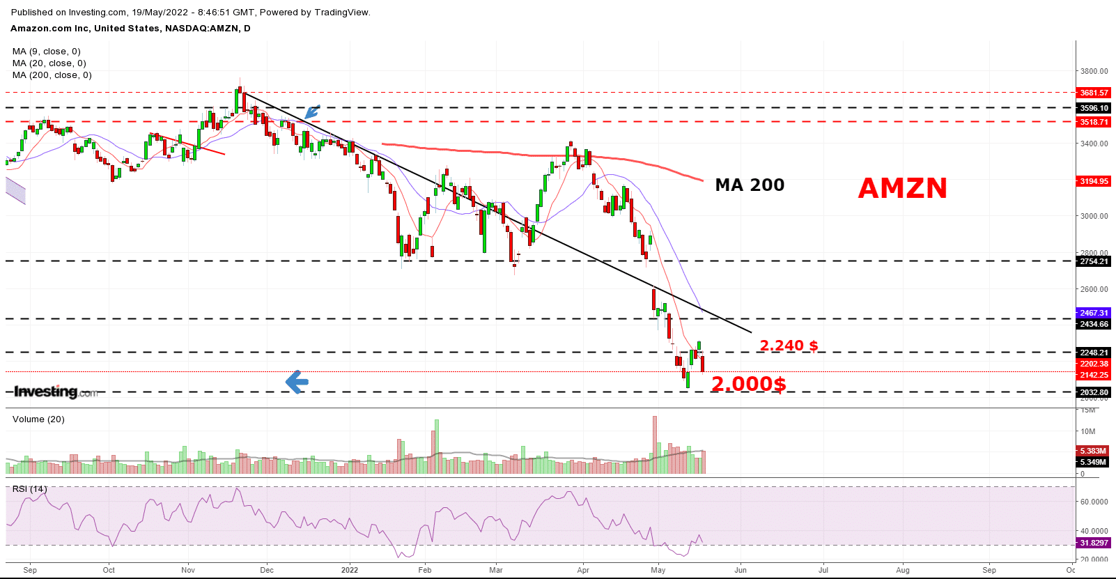 Hay que tener en cuenta que los inversores en AMZN dispondrán ahora de posibilidades de trocear sus posiciones de acciones al contado con ventas parciales , dado el sombrío panorama que se presenta para el sector al medio plazo. Hasta ahora, era difícil con los altos precios de las acciones. Por lo tanto podemos tener cortos importantes en las próximas horas hasta que se equilibren las pociones.