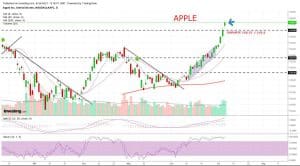 Corrección necesaria y normal en la trend alcista del NASDAQ que lidera el mercado la tendencia – observándola por el ADX – no se ve afectada y, lo habitual por patrón, es que el canal alcista sirva de soporte. Esta situación de sobre compra en tendencia y subida de la volatilidad la vimos de forma clara ayer en la apertura parabólica de Apple y AMZN, igualando máximos en el caso de “la manzana”.