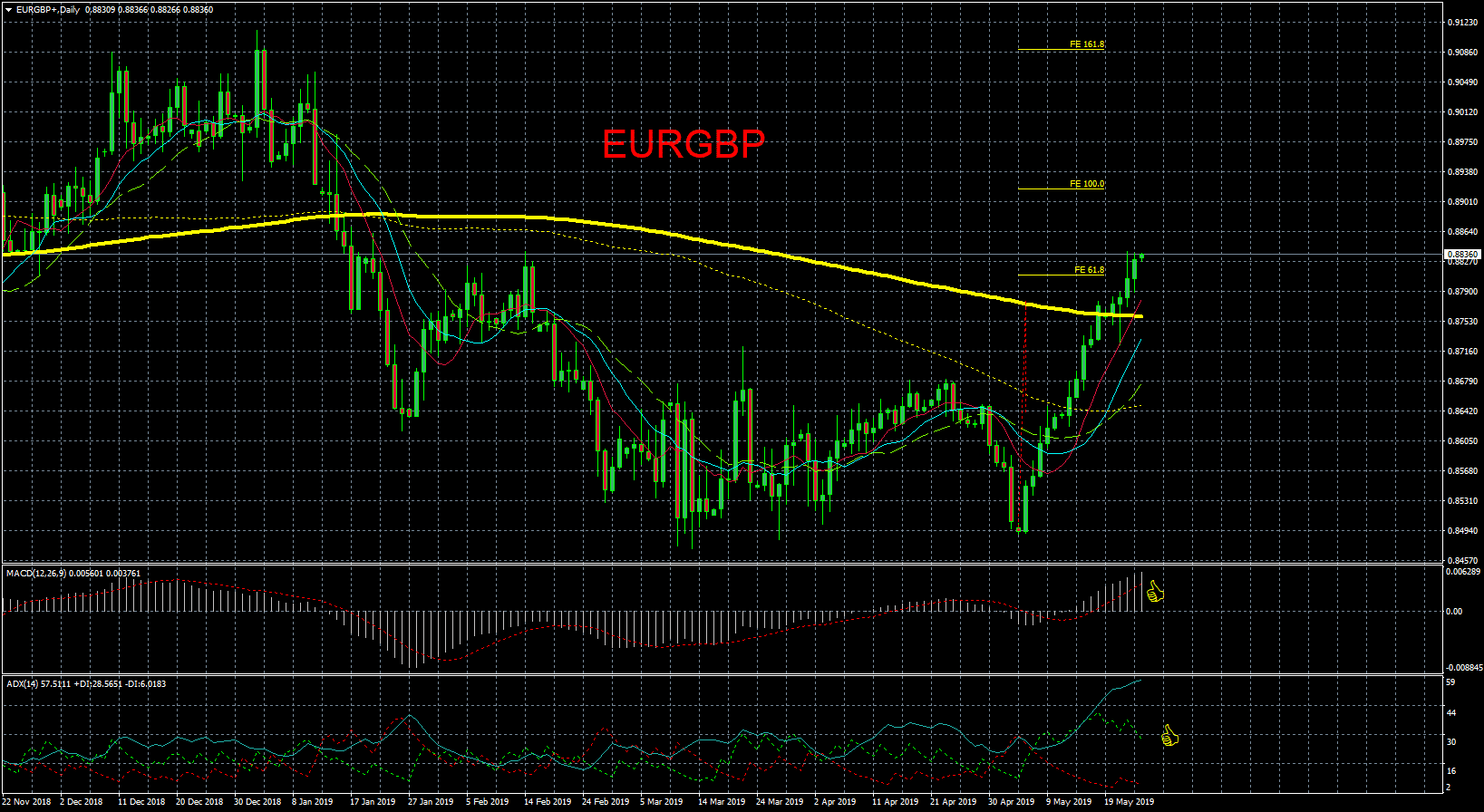 La propuesta de hoy pasa por el Par EURGBP; ante la posible dimisión de May – no confirmada en el momento de escribir este artículo – el activo sigue alcista y con recorrido a tenor de lo que presenta la expansión de Fibonacci. Será operar con el rumor y, posiblemente vender con la noticia. Si entra tarde, no hay que preocuparse porque pueden venir rebotes o reacciones en EURUSD.