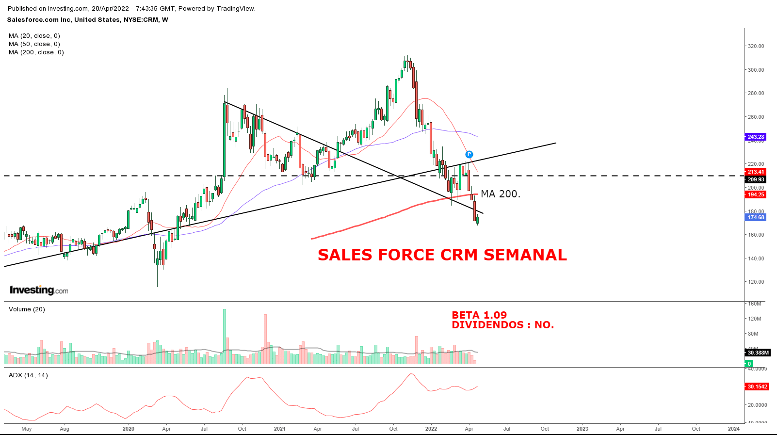 La alternativa a las Big Tech, Salesforce, de la que hemos hablado muchas veces por su excelente desempeño, también está sufriendo el castigo del mercado a todas las tech de crecimiento. Esta acción, cotiza en el continuo de N.Y. NYSE y no presenta resultados hasta 19 de mayo. No obstante, su pérdida es notoria.