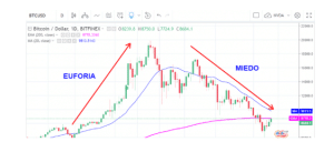 En lo que podríamos llamar zona de euforia, que es cuando el precio muestra una tendencia claramente alcista, el optimismo es alimentado por noticias que motivan a la masa a comprar de manera inconsciente, dejándose llevar por el “no te pierdas esta gran oportunidad”, “muchos están volviéndose millonarios con el Bitcoin, y tú te quedarás atrás”, “el Bitcoin llegará a los 50k dólares y muchos inversores apuestan por él”. Ante estos estímulos externos procedemos sin hacerle caso a nuestro razonamiento y no nos importa comprar a un precio más alto, porque “Se nos va el tren y quedaremos por fuera de él”.
